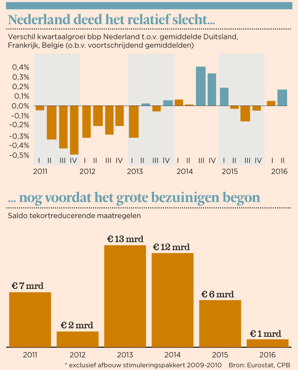 De misdaad wordt nu veel duidelijker: vooral in 2011 en 2012 deed Nederland het slecht. Dat waren de jaren dat we onze achterstand opliepen. In 2013 en 2014 groeide de economie ongeveer net zo hard als de andere drie. Soms zelfs harder.